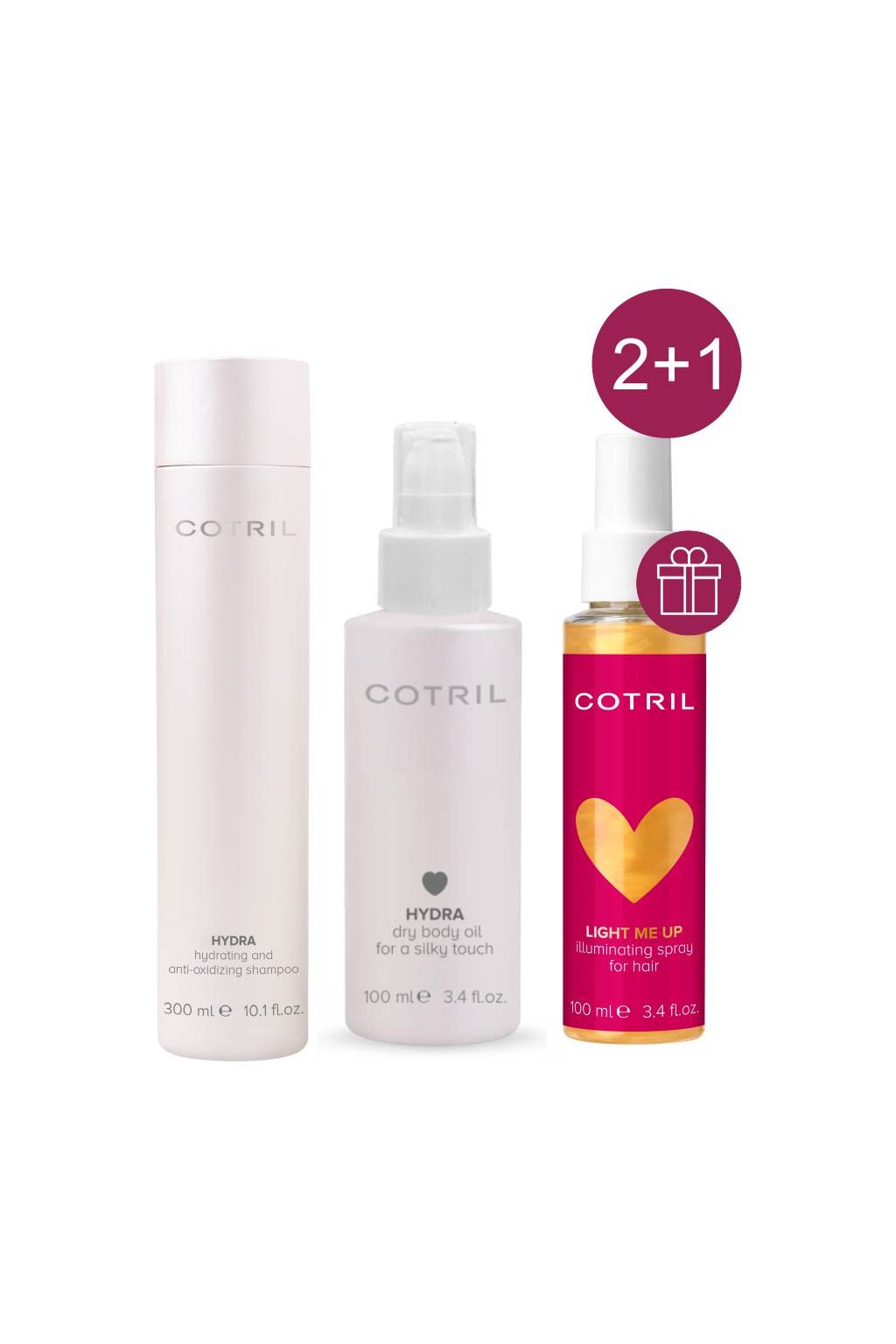 Akce 2+1 Cotril HYDRA Šampon, suchý tělový olej +ZDARMA Light Me Up rozjasňující sprej 100ml