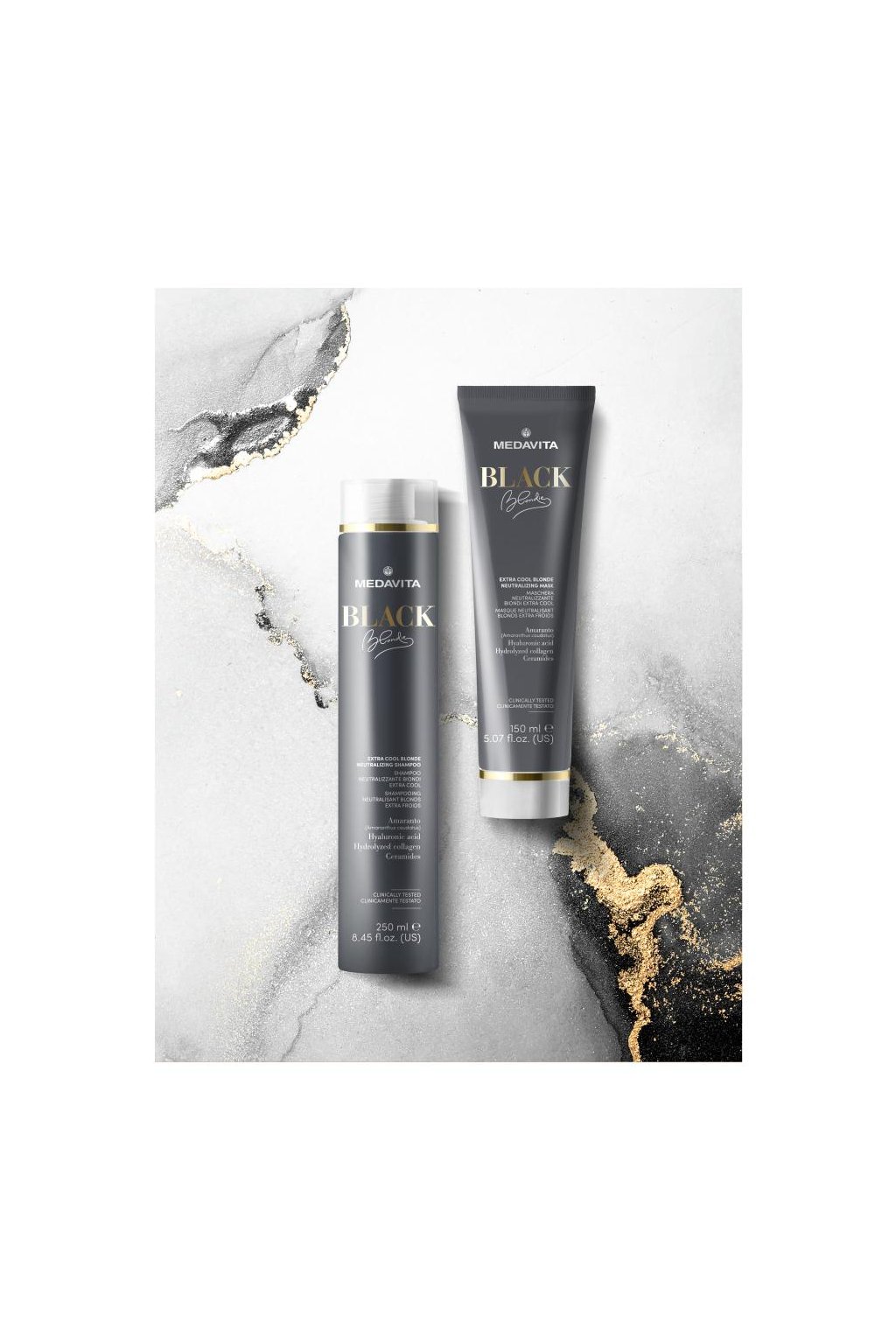 Černá mycí péče, vyvinutá pro vytvoření extra studeného odstínu blond vlasů a pro neutralizaci nežádoucích teplých odlesků. Silver Blonde je novým trendem pro všechny, kteří milují stříbrnou blond. Silver Blonde je nová multi-odstínová barva, která kombinuje světlou blond s dotekem stříbra. Podobně jako platinová blond je chladnější, má tmavší stříbrný nádech a výsledkem je lesklá barva s metalickým efektem. Stříbrná blond je skvělou volbou pro každého, kdo touží po přirozeném, ale sofistikovaném vzhledu. Je ideální pro každého, kdo chce diskrétně zakrýt své přirozené blond, světle hnědé nebo šedivé vlasy. Použití černého šamponu společně s černou maskou zaručuje maximální kosmetický efekt barvení vlasů.