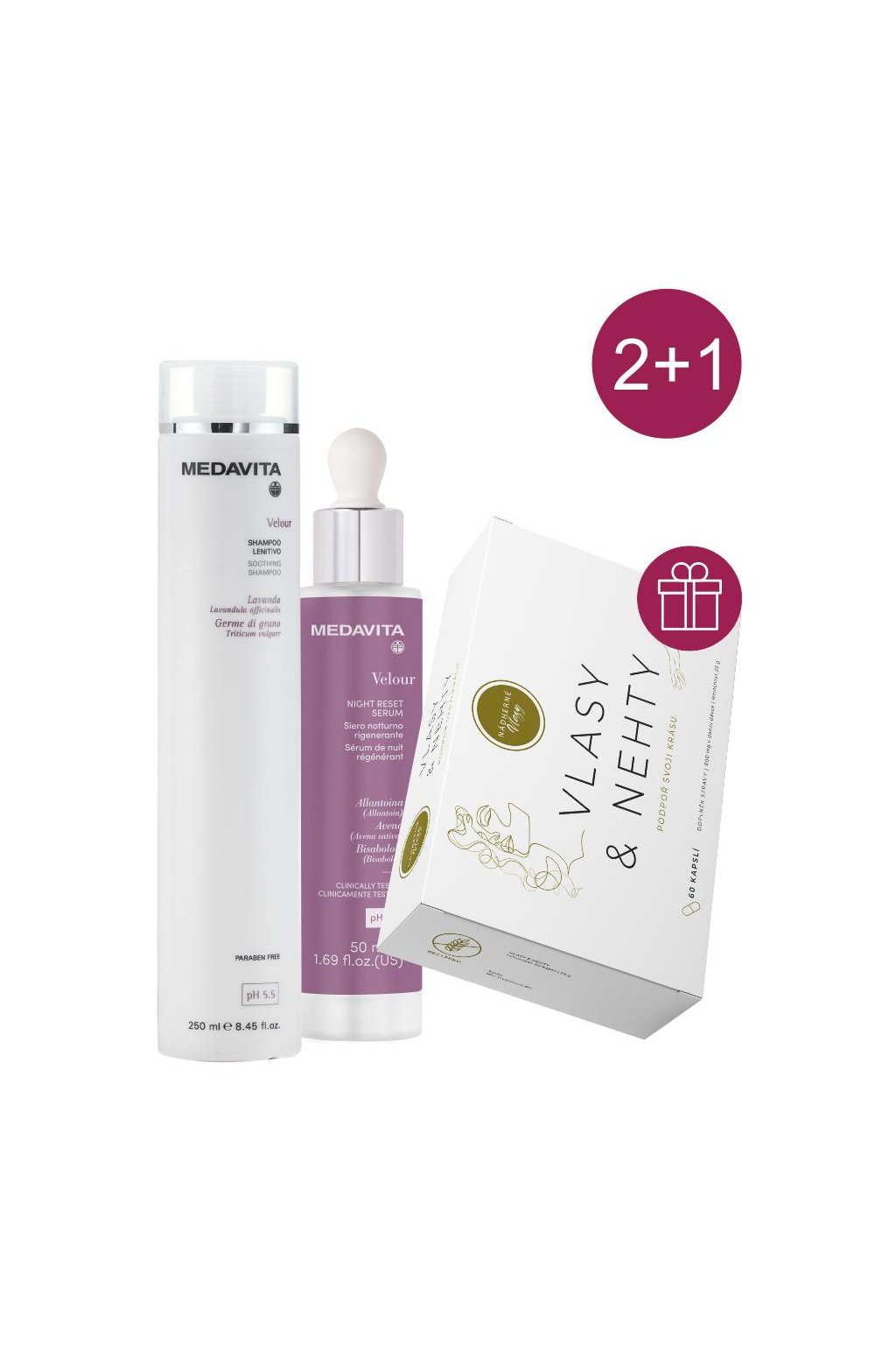 Akce 2+1 Medavita VELOUR šampon, noční sérum +ZDARMA Kapsle pro vlasy a nehty