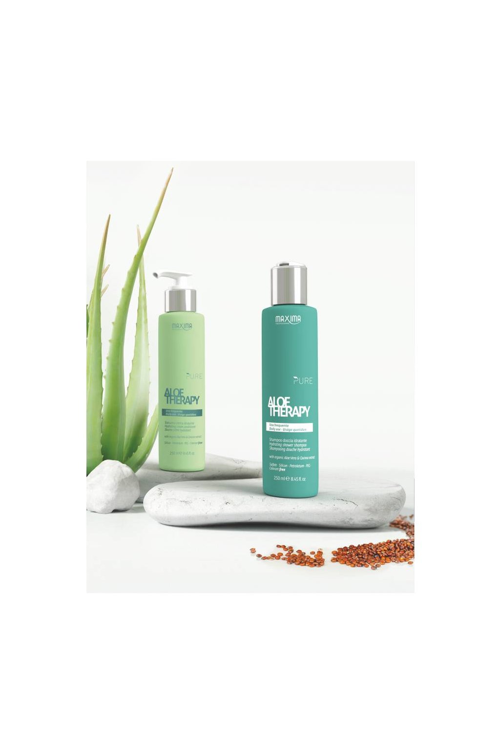 Nový zážitek každodenní čistoty pro celou rodinu! Objevte nový regenerační rituál Maxima, ideální pro jemné mytí vlasů i pokožky, v salonu nebo doma. Složení s aktivními rostlinnými složkami biologického původu, bez sulfátů, silikonů, parabenů, vazelíny, PEG, barviv a ropných derivátů, řada Aloe Therapy byla speciálně navržena tak, aby nabízela kompletní péči o sebe sama, s naprostým respektem k přírodě.