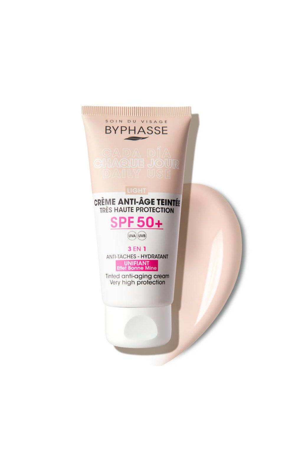 Byphasse Anti-Aging Tinted Light Face Cream SPF 50+. Věděli jste, že každodenní používání krému s vysokou ochranou SPF je nejúčinnější prevencí proti předčasnému stárnutí pleti? Denní krém proti stárnutí poskytuje velmi vysokou ochranu před slunečním zářením UVA/UVB a zároveň pomáhá sjednotit tón pleti. Obsahuje kyselinu hyaluronovou a vitamín E. Tyto dvě aktivní složky pleť hydratují, chrání a pomáhají předcházet stárnutí pleti, která je způsobena slunečním zářením. Jemné zabarvení vytváří přirozený efekt a sjednocuje pleť. Vaše pleť bude hydratovaná, chráněná a s přirozeně sjednoceným tónem.