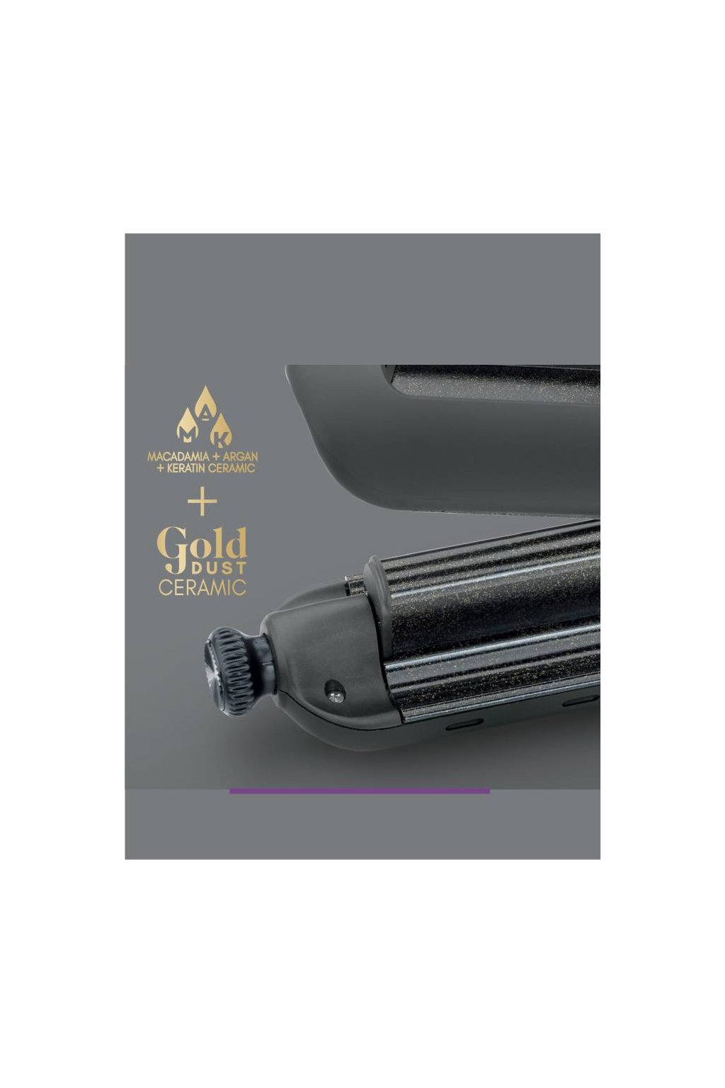 » Keramické destičky Gold Dust se zlatým prachem plus MAK* kombinují vodivost zlata s hladkým povrchem obohaceným o makadamiový, arganový olej a keratin pro super hladký, lesklý a dlouhotrvající styling.