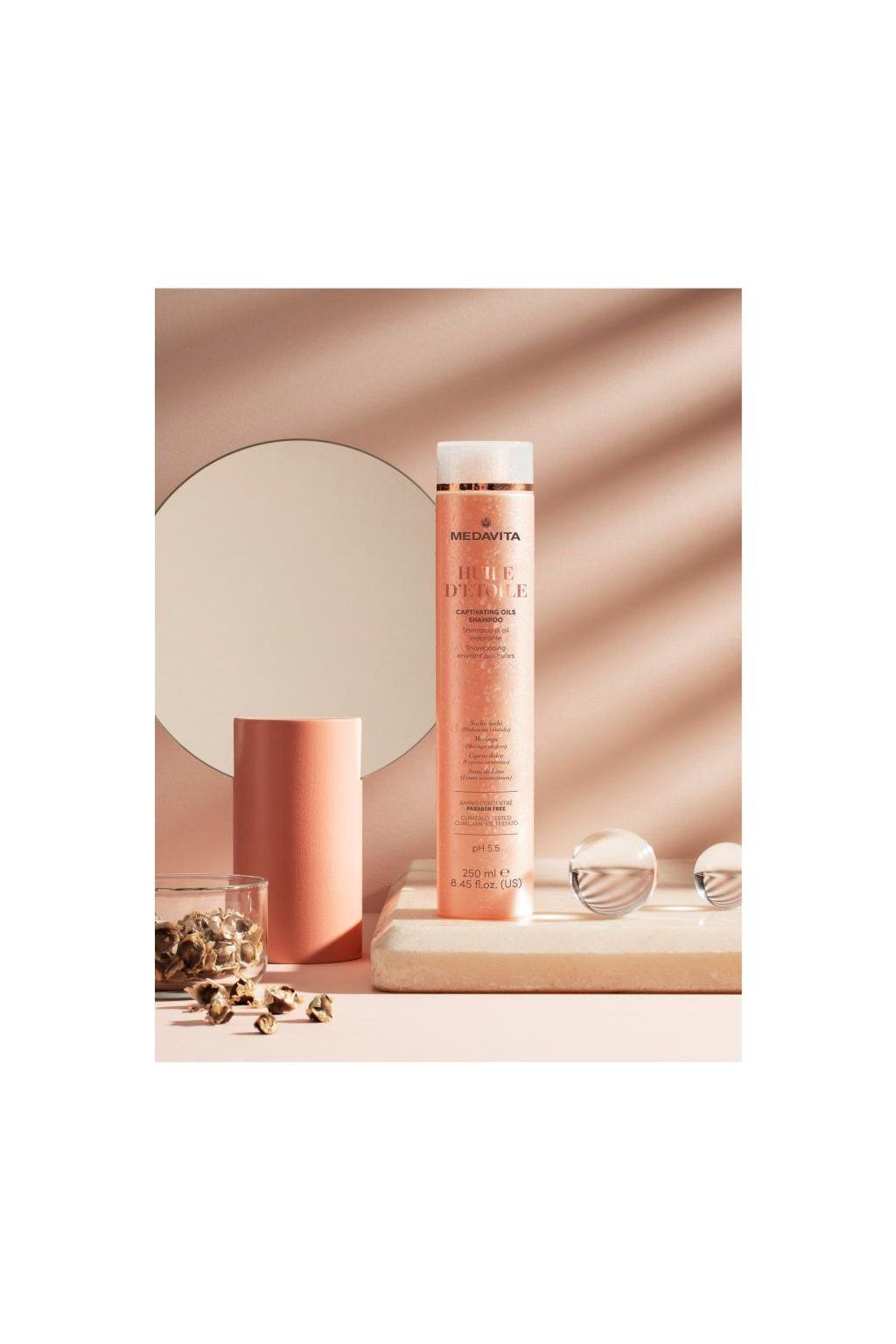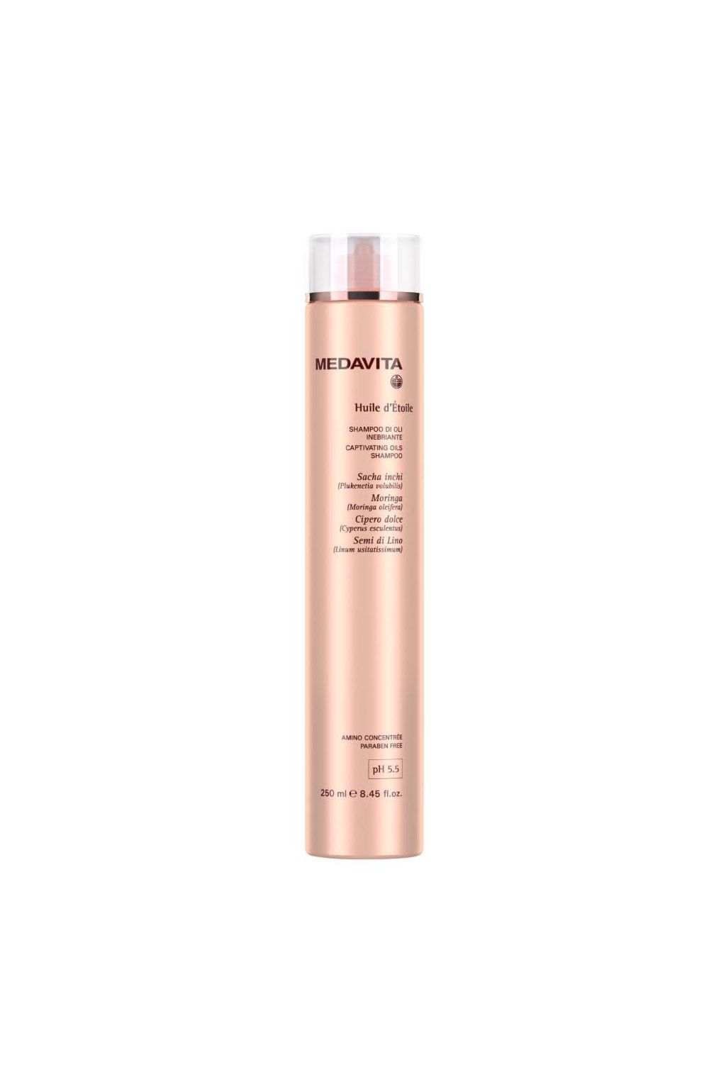 Medavita Huile d'Etoile Captivating Oils Shampoo - Šampon pro nádherné vlasy s exkluzivním komplexem přírodních olejů, vlasovému vláknu daruje extrémní lesk a hebkost. Speciální složení umožňuje vyvážené mytí a exkluzivní komplex olejů (Sacha inchi, šáchor jedlý – zemní mandle, lněná semínka a moringa), bohatý na přírodní antioxidanty, dává extrémní lesk a výživu vlasovému vláknu, které chrání a obnovuje jeho přirozenou ochrannou bariéru. Díky obsahu pantenolu zabraňuje dehydrataci. Vhodný pro všechny typy vlasů. Složení obohaceno o drahocenný komplex Amino Concentrée, který spouští okamžité přímé pečující působení na potřebných místech vlasového vlákna a prodloužené nepřímé pečující působení, které zapečetí funkční složky ve vlasovém vláknu pro výsledek dlouhodobě nádherných vlasů.