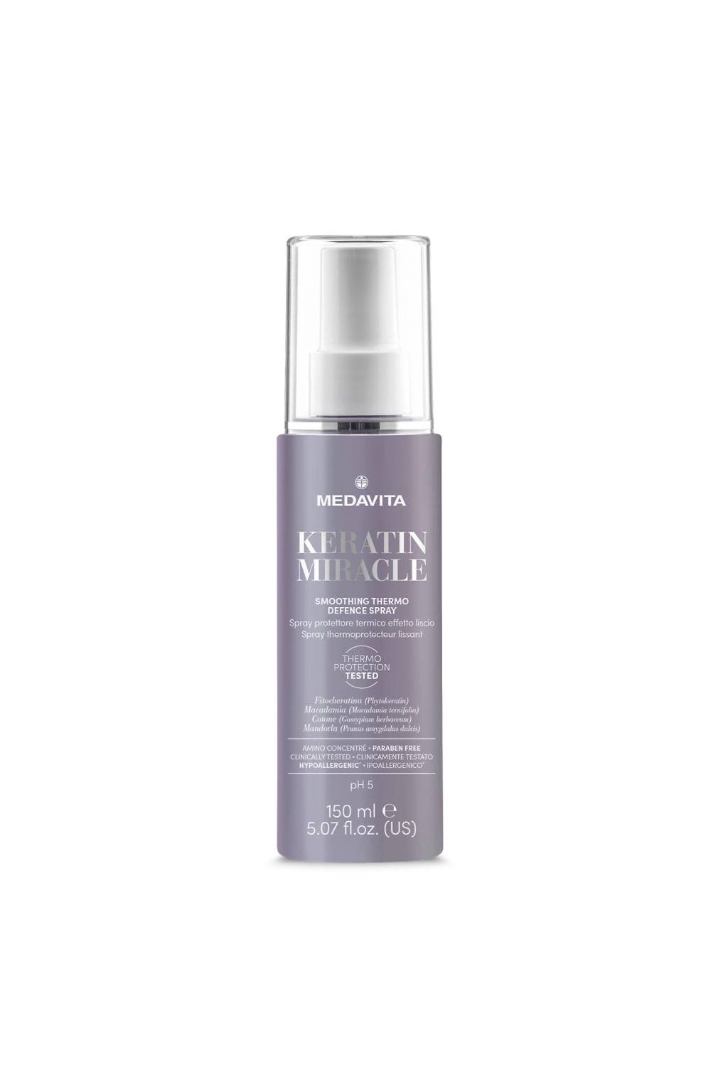 Medavita Keratin Miracle SMOOTHING THERMO DEFENCE SPRAY - Ochranný sprej proti vysokým teplotám s uhlazujícím efektem. Termo ochranný sprej chránící vlasové vlákno před vysokými teplotami při použití stylingových přístrojů na úpravu vlasů o teplotách až do 230°C. Uzavírá vlasovou kutikulu, zachovává lesk vlasů, bojuje proti vlhkosti a efektu krepatých vlasů. Vhodný pro všechny typy vlasů. Neobsahuje parabeny.